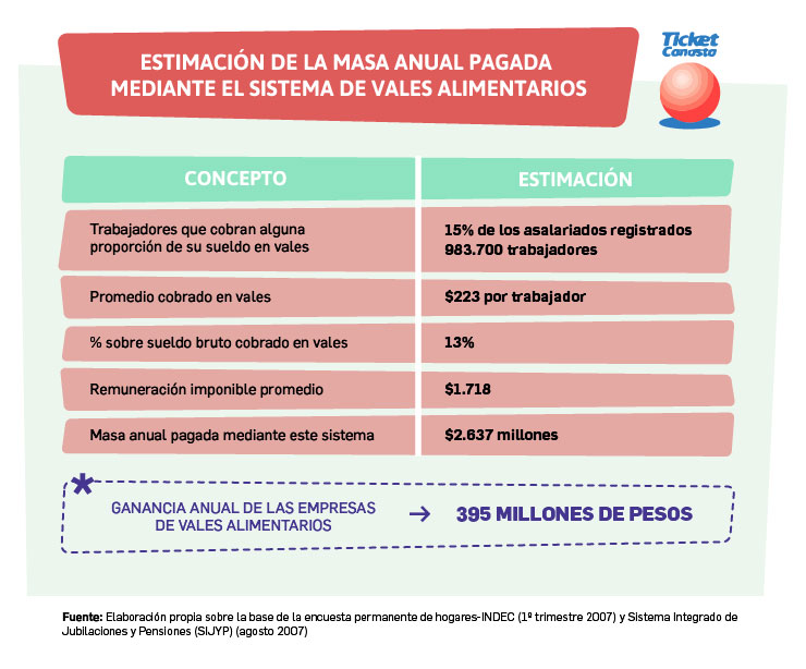 Según la información difundida por la cámara empresaria, las ganancias anuales por la emisión de tickets oscilaban entre 140 millones y 395 millones de pesos, con un dólar a unos 3,15 pesos a fines de 2007. Ese monto surgía de calcular las ganancias obtenidas sólo por la venta y recompra de los tickets que recibían 1.417.000 trabajadores ( más del 15% del total de empleados registrados), de acuerdo con los datos de CEVAS. El negocio generado por la masa de dinero que las emisoras de vales podían colocar en el mercado financiero, entre la emisión y la recompra no está calculado.