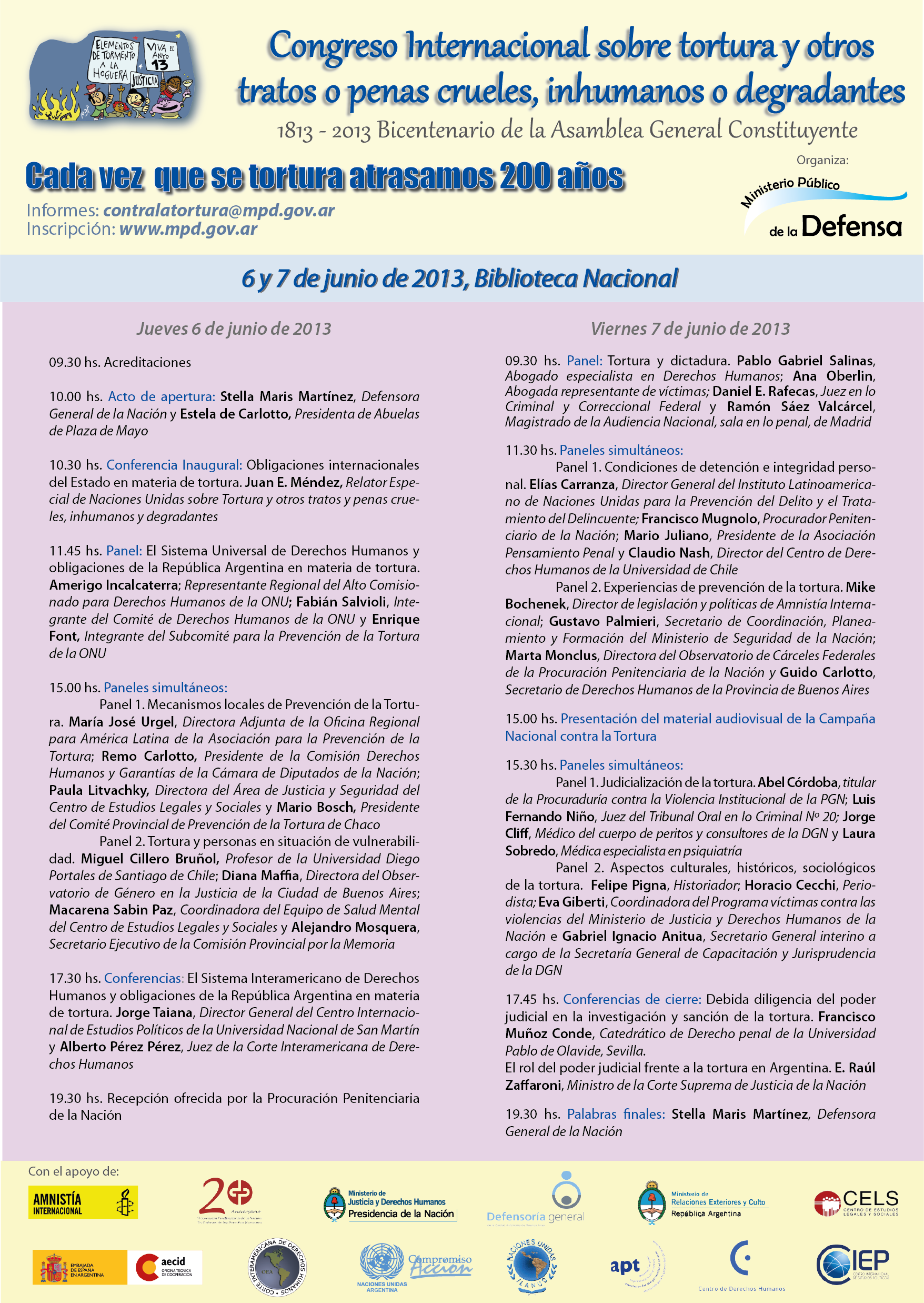 La Defensoría General de la Nación organiza el “Congreso Internacional sobre tortura y otros tratos o penas crueles, inhumanos o degradantes”. Participarán importantes figuras de la Justicia y de diversas instituciones del Estado, organizadas en seis paneles y tres conferencias. Será en la Biblioteca Nacional, el 6 y 7 de junio.