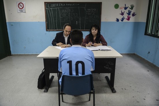 Para llegar al Complejo Penitenciario Federal de Marcos Paz desde la Ciudad de Buenos Aires, hay que viajar unos 40 kilómetros por autopistas, rutas y caminos de tierra, y subir y bajar de entre tres y cuatro de colectivos. Una vez allí, después de pasar los controles, resta una caminata de varias cuadras hasta la entrada del complejo que aloja a jóvenes adultos de entre dieciocho y veinticinco años. Todos los jueves llegan hasta ahí, además de las visitas, dos mediadores del Ministerio de Justicia. Van a encontrarse con los internos que piden mediación. Entre los pasillos pintados de celeste y bajo los techos alambrados, los internos esperan para entrar al salón de la unidad educativa donde se realizan las entrevistas.