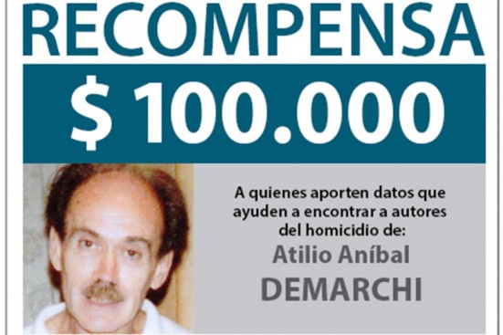 A través del Programa Nacional de Coordinación para la Búsqueda de Personas Ordenada por la Justicia (BUSCAR), el Ministerio de Justicia y Derechos Humanos de la Nación dispuso una recompensa de 100 mil pesos para quien aporte datos útiles sobre el paradero de los autores del crimen del profesor jubilado Atilio Aníbal Demarchi.