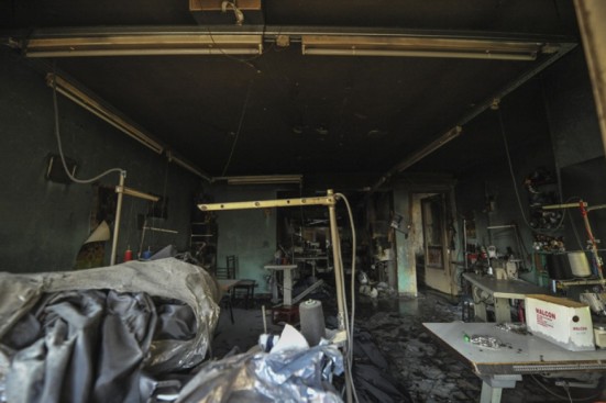 Por la ventana enrejada puede verse el techo ennegrecido por humo y las máquinas de coser arrumbadas entre charcos del agua que los bomberos de la Policía Federal utilizaron para apagar el incendio. También pueden verse madejas de hilo de diferentes colores, bolsas con telas derretidas por el calor de las llamas. Afuera, en la vereda, una tabla de madera típica de una mesa de corte, carbonizada.